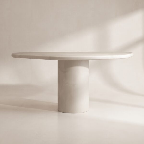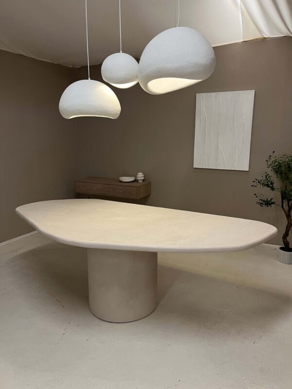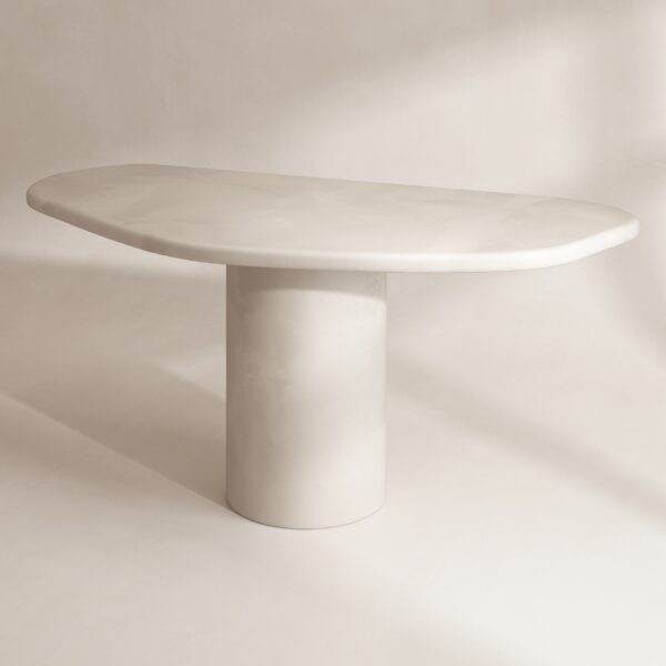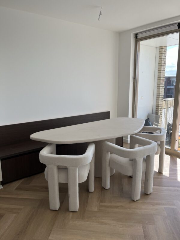 Forma is een eigentijdse eettafel met een organisch vorm speciaal ontworpen voor een zitbank aan één zijde. De beton ciré afwerking geeft de tafel een moderne uitstraling met een industrieel tintje. Met deze eettafel breng je ingetogen elegantie naar je eetruimte. Krasbestendig en gemakkelijk te onderhouden, biedt deze tafel een balans tussen minimalistisch design en praktische bruikbaarheid. Maatwerkopties zorgen ervoor dat de tafel perfect aansluit bij elke ruimte.