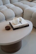 De Shady salontafel biedt een perfecte balans tussen modern design en duurzame materialen. Het microcement beton ciré tafelblad en de ronde houten poot vormen samen een krachtige, moderne en luxe uitstraling.