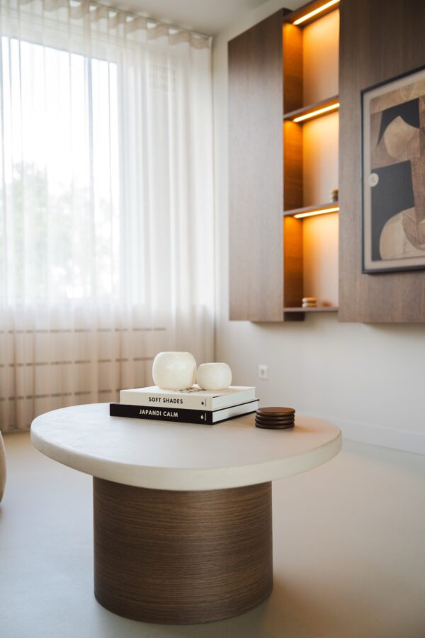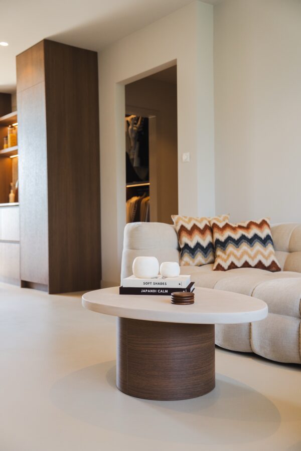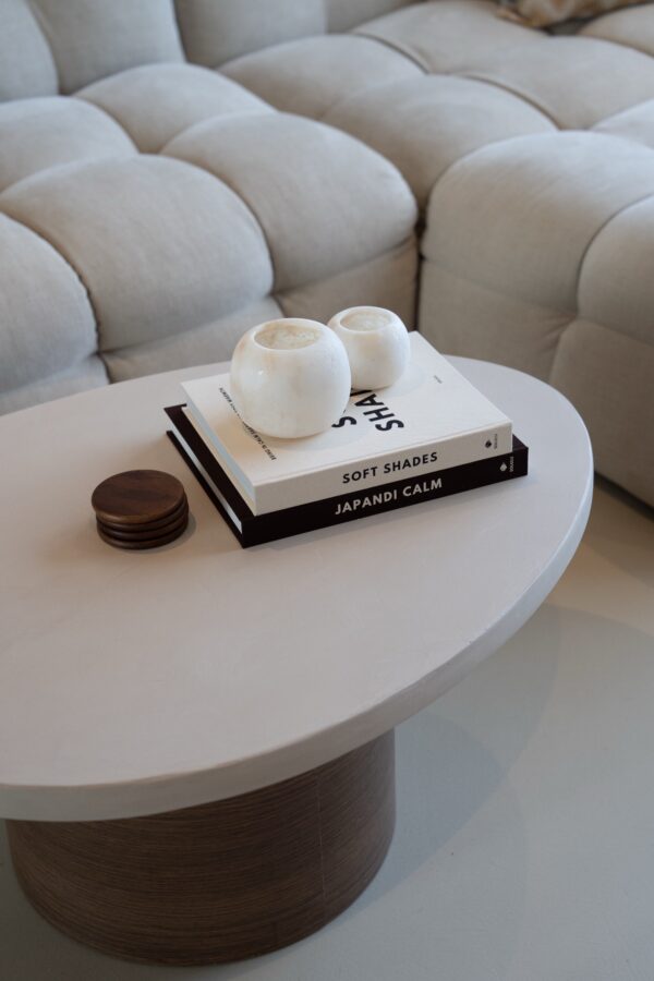 De Shady salontafel biedt een perfecte balans tussen modern design en duurzame materialen. Het microcement beton ciré tafelblad en de ronde houten poot vormen samen een krachtige, moderne en luxe uitstraling.